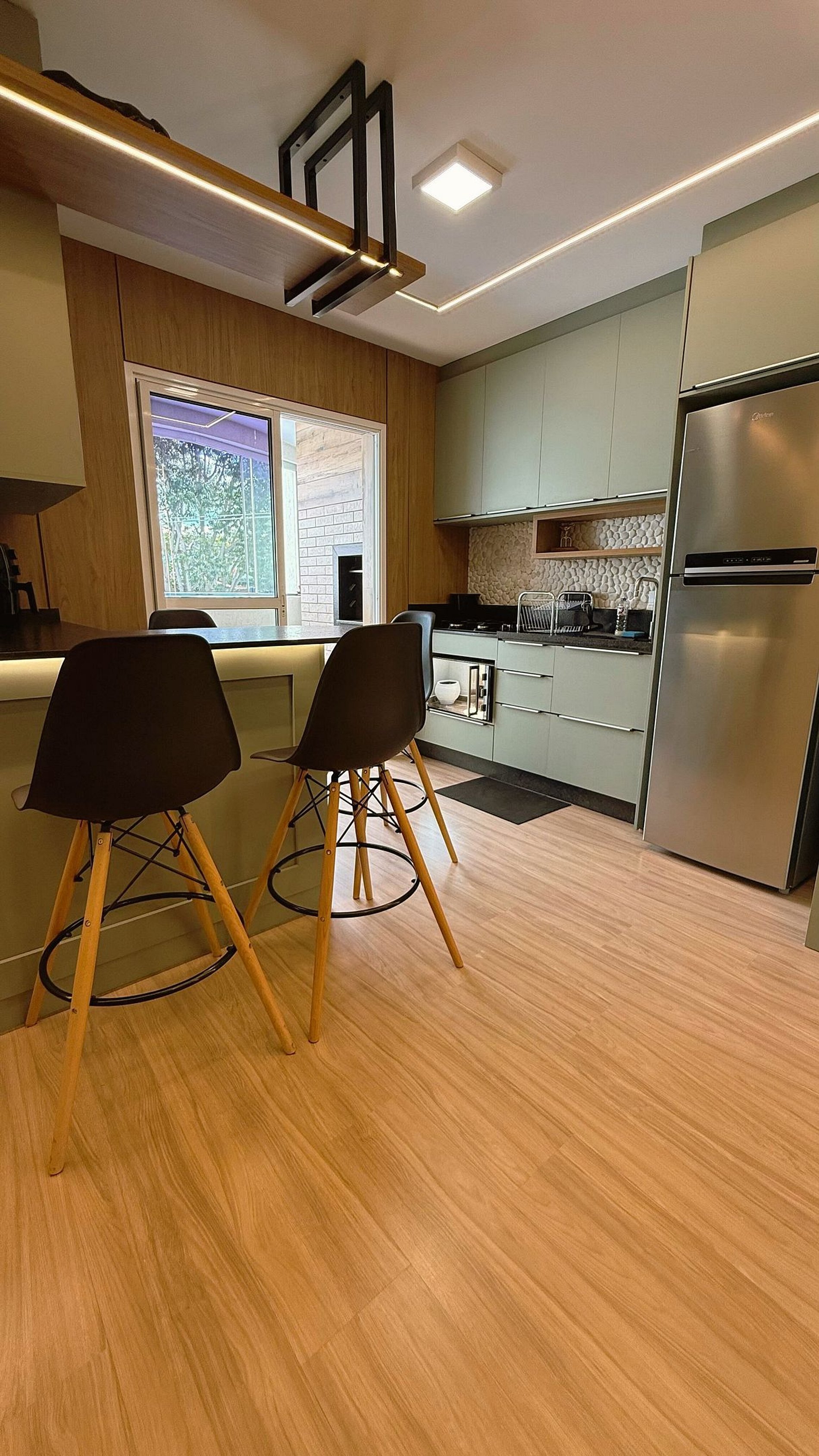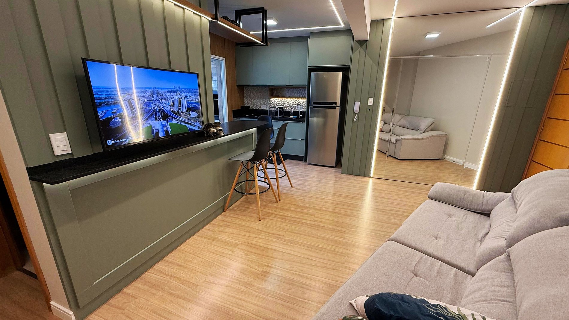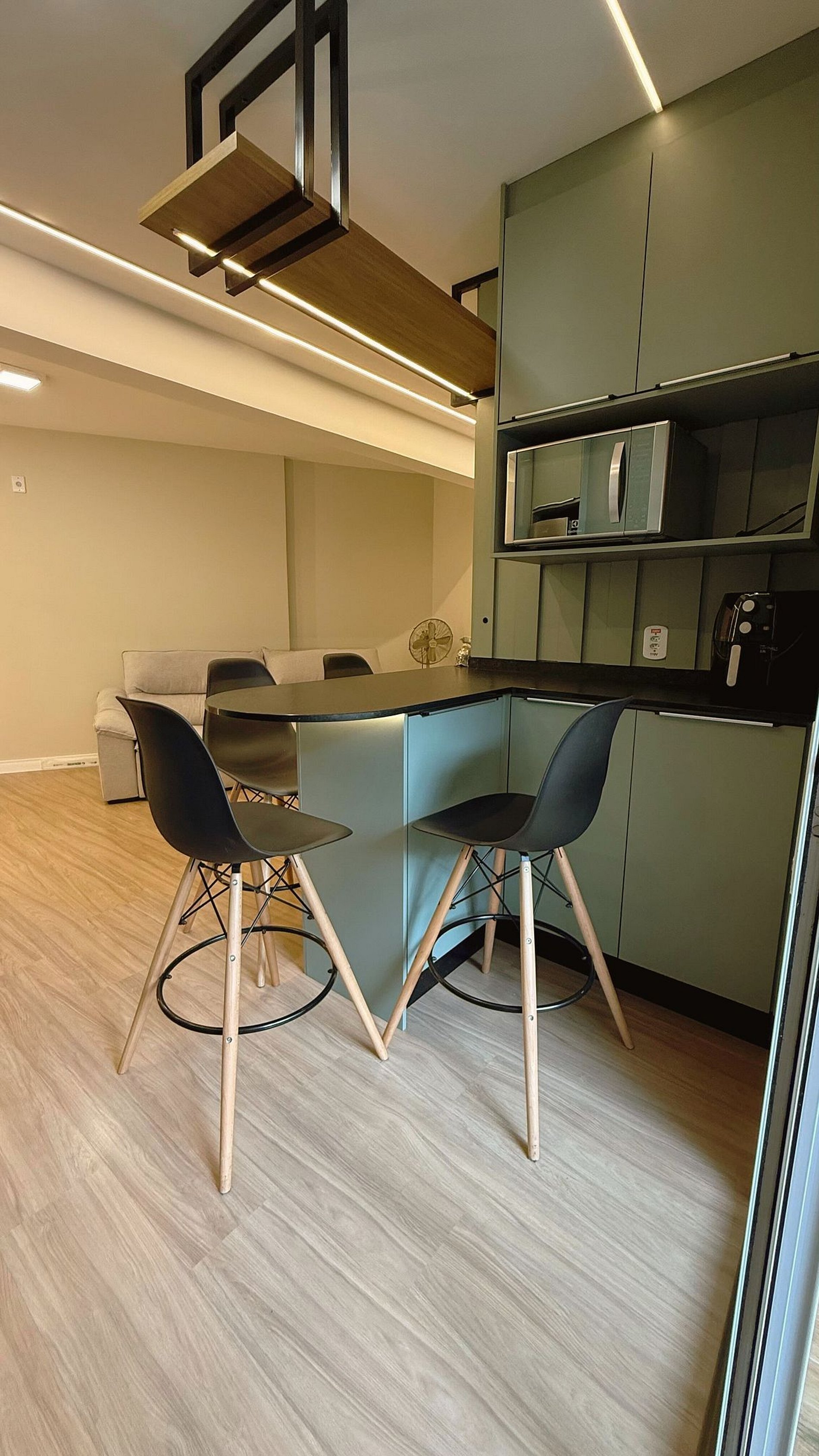 Apartamento lindamente decorado, com móveis planejados que proporcionam praticidade e conforto. A cozinha é completa e equipada com forno, fogão cooktop, micro-ondas, geladeira frost free com freezer e air fryer, oferecendo tudo o que você precisa para o dia a dia. A sala conta com sofá confortável e ambiente aconchegante para relaxar.