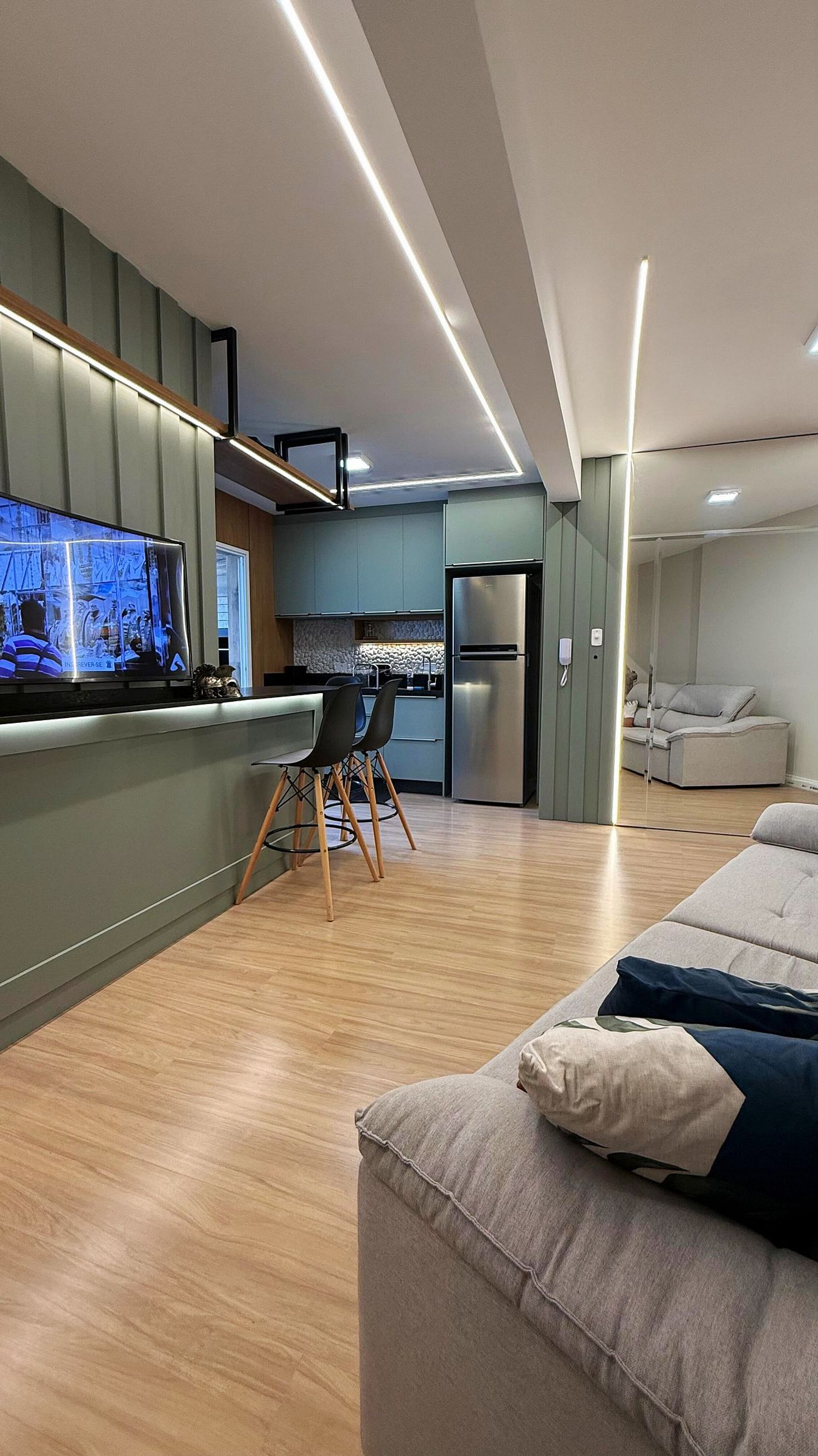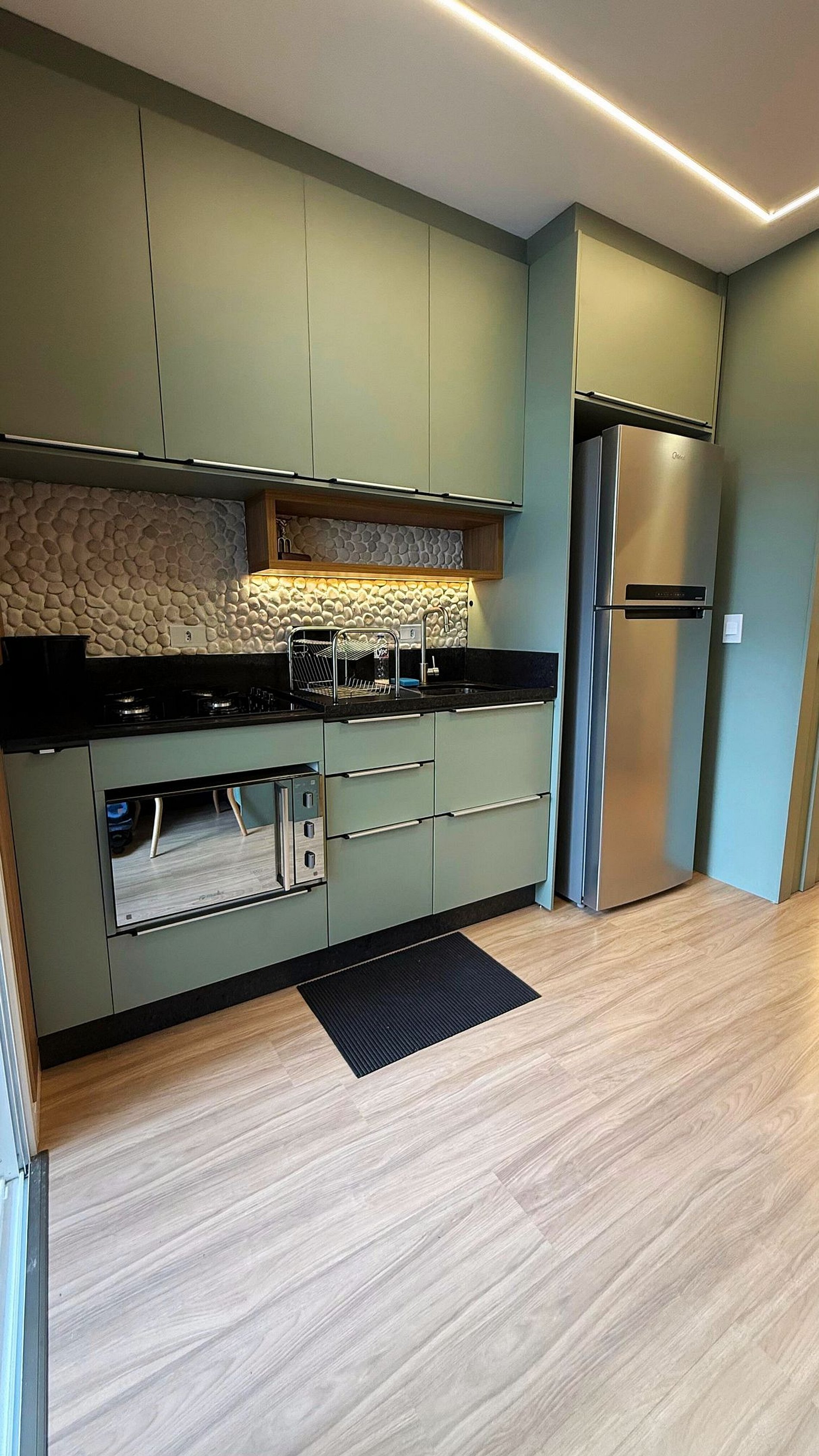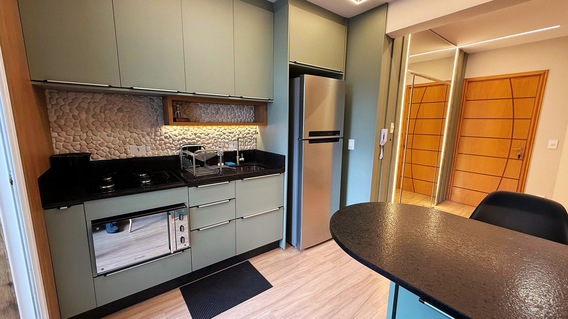 Apartamento lindamente decorado, com móveis planejados que proporcionam praticidade e conforto. A cozinha é completa e equipada com forno, fogão cooktop, micro-ondas, geladeira frost free com freezer e air fryer, oferecendo tudo o que você precisa para o dia a dia. A sala conta com sofá confortável e ambiente aconchegante para relaxar.